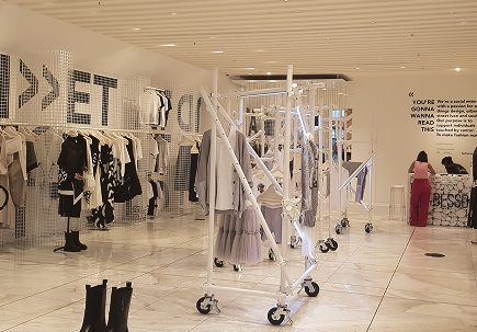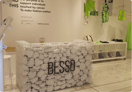 A clean retail space built around soft neutral tones and bold display pieces that reflect the BLSSD identity. Mesh textures, marble surfaces, and simple fixtures create a modern and inviting feel.