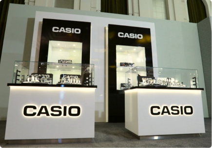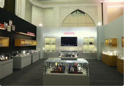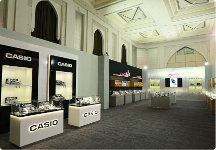 A contemporary event in Dubai, crafted to highlight precision and durability. Custom display units and illuminated vitrines are seamlessly integrated within a clean architectural framework.