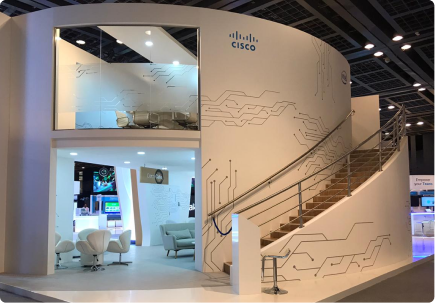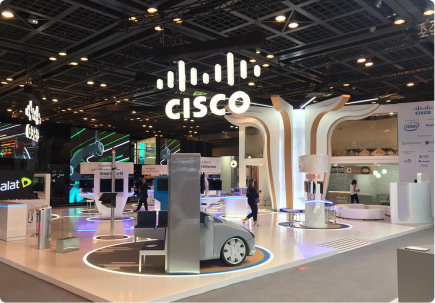 A large-scale exhibition stand for Cisco, defined by fluid architectural forms and a strong central feature. Integrated lighting and layered floor patterns guide movement while highlighting key product zones.