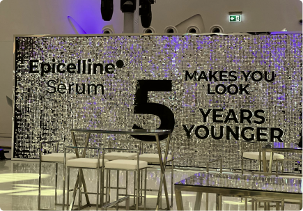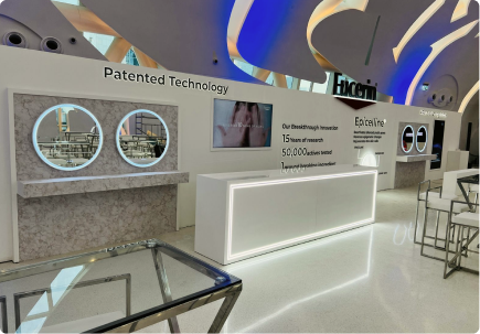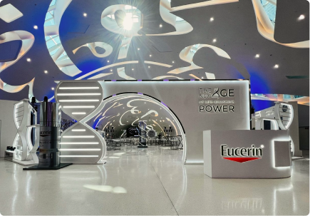 An immersive event environment for Eucerin, defined by fluid forms and high-gloss finishes. Sculptural elements and integrated lighting create a futuristic setting that enhances product storytelling and brand innovation.