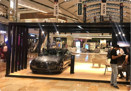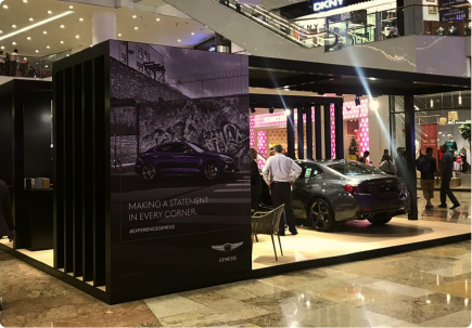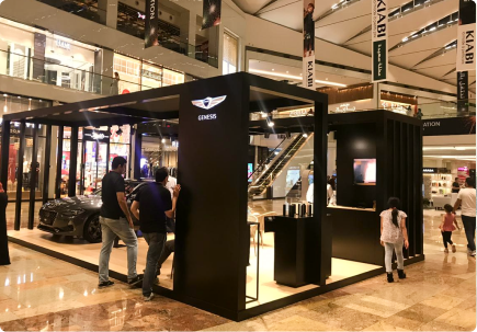 A bold mall activation for Genesis, defined by a sleek black structure that frames the cars with strong visual contrast. Open sides and integrated lighting invite interaction while maintaining a premium feel.