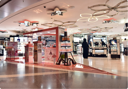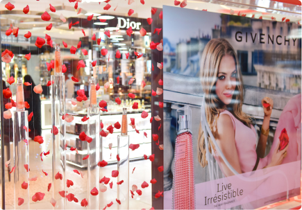 A striking travel retail activation for Givenchy, using transparent structures and suspended elements to create depth and movement.