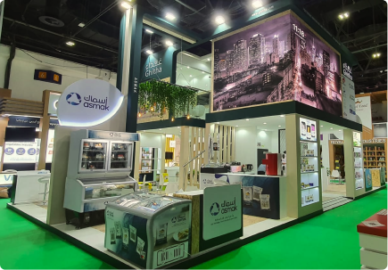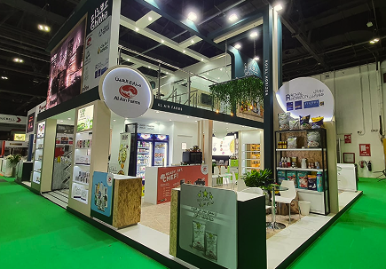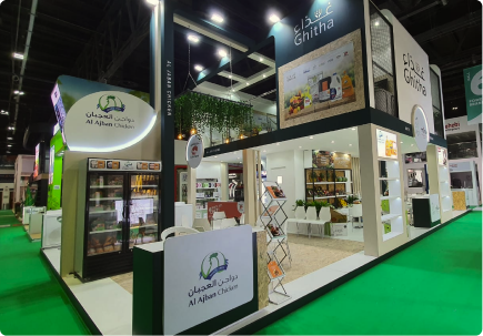A vibrant exhibition stand for Gritha, combining clean architectural lines with fresh, market-inspired elements. Layered display zones and integrated product showcases create an inviting and functional layout.