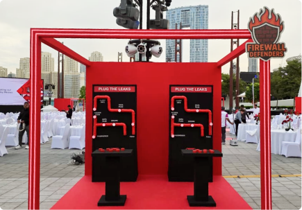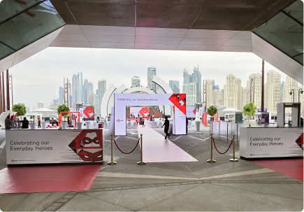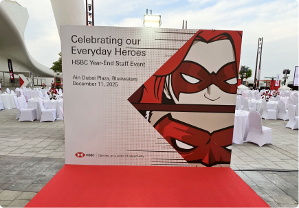 A bold outdoor event setup for HSBC, defined by striking geometric forms and a strong brand-led color palette. Modular structures and elevated staging elements create clear focal points and guide visitor engagement.