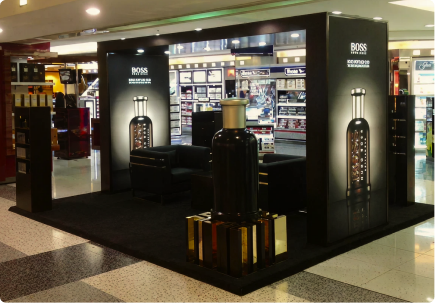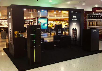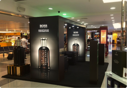 A sleek travel retail activation for Hugo Boss, defined by dark finishes and illuminated product displays that create a premium feel. Clean lines and structured layouts guide customer flow and highlight key products.