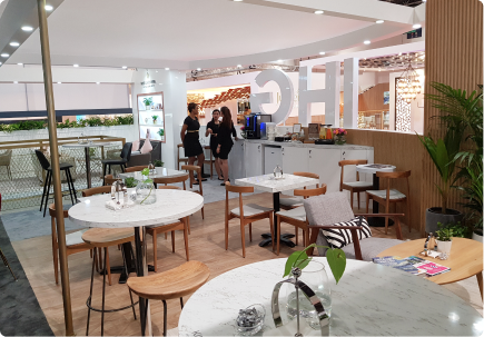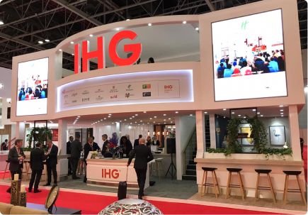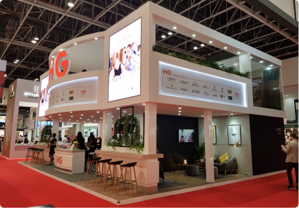 A refined, hospitality-inspired stand that blends warm materials with clean architectural lines to reflect the IHG brand. Soft lighting, textured finishes, and layered zones create an inviting, lounge-like experience within the exhibition space.