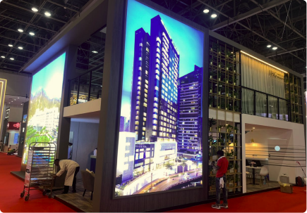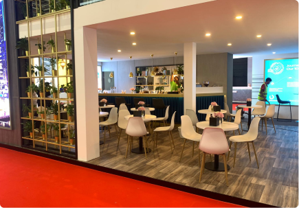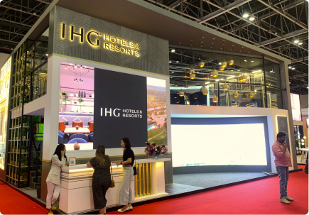 A contemporary exhibition space shaped to reflect IHG’s hospitality environments through layered textures and residential-style detailing. Warm timber finishes, glazed partitions, and curated lighting create a refined and inviting setting.