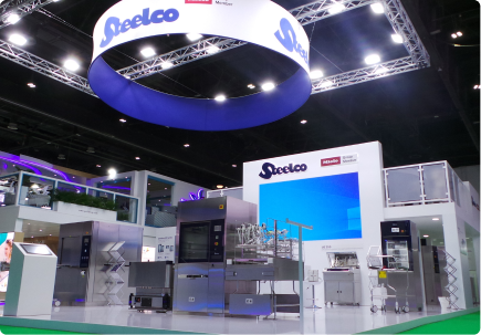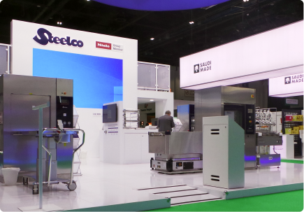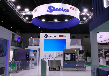 A clean, product-focused stand defined by crisp white structures and bold brand accents that highlight Steelco’s equipment with clarity. Elevated platforms and integrated lighting enhance visibility while maintaining a streamlined, technical aesthetic.