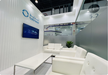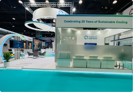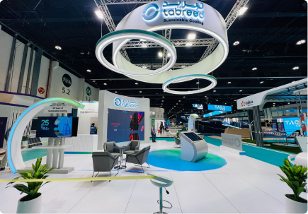 A fluid, contemporary stand defined by curved architectural forms and suspended ring elements that echo Tabreed’s cooling expertise. A refined palette of whites and cool tones is complemented by integrated lighting and seamless finishes.